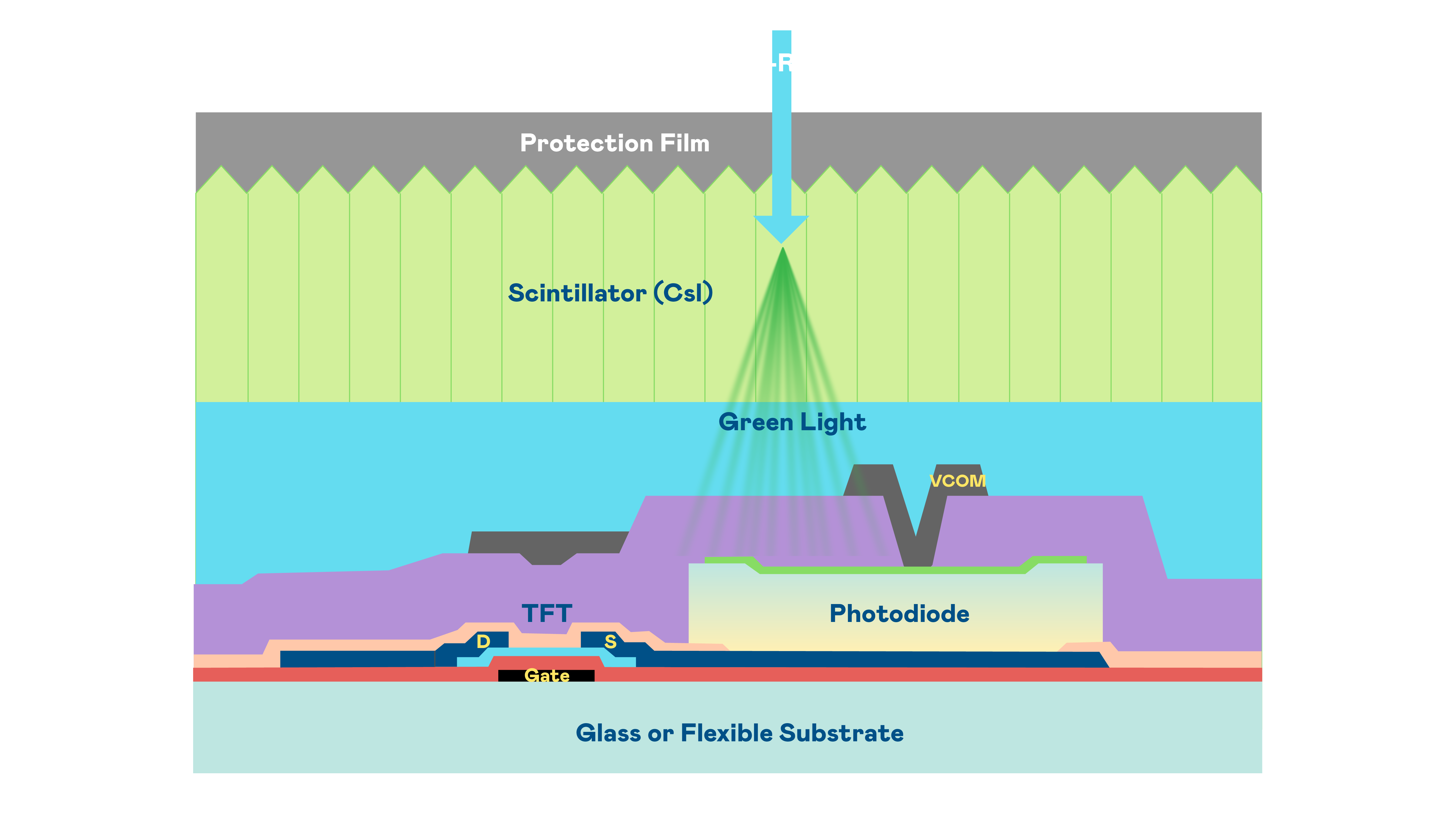 壹号娱乐的X光影像感测阵列使用薄膜电晶体 (TFT) 作为每个像素的读取开关,搭配光电二极体(Photodiode)的光电转换元件,用以感测X光影像讯号。